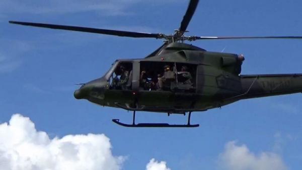 Helikopter TNI terbang membawa personel membagikan selebaran berisi imbauan kepada kelompok teroris MIT Poso untuk menyerahkan diri, Sabtu (12/1/2019). (Foto: iNews/Yoanes Litha)