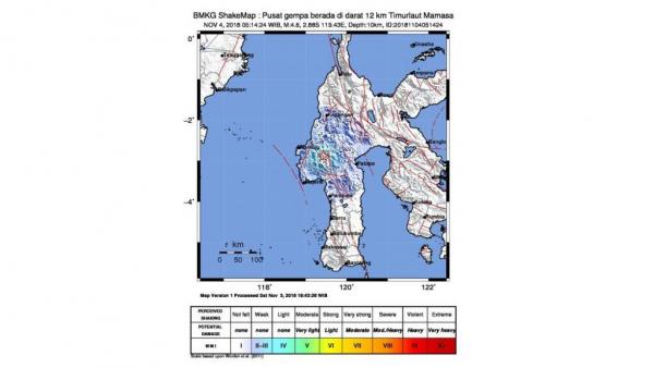 Dari catatan BMKG, gempa bumi pertama berkekuatan 4,8 Skala Richter (SR) menggucang Pukul 01.36 WIB. Tak lama berselang, gempa kembali menggucang Mamasa dengan kekuatan yang lebih kecil yakni 3,0 SR pada pukul 01.47 WIB.