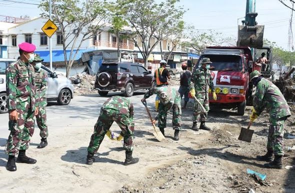 PALU, iNews.id – Sedikitnya 757 personel TNI yang tergabung dalam Komando Tugas Gabungan Terpadu (Kogasgabpad) penanggulangan bencana gempa bumi dan tsunami di Kota Palu, Sulawesi tengah (Sulteng), melaksanakan pembersihan dan menormalisasi Jalan Yos Sudarso di pesisir Pantai Talise, Rabu (17/10/2018). Prajurit dari Satuan Korps Marinir ini dipimpin Kolonel Marinir Arinto Benny Sarana sebagai Komandan Sektor Donggala.