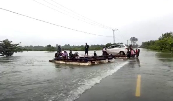 Untuk bisa melanjutkan perjalanan, para pengendara harus membayar jasa rakit darurat yang telah disiapkan warga setempat.