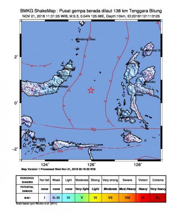 Badan Meteorologi Klimatologi dan Geofisika (BMKG) menyebutkan, gempa berlokasi di 0.54 Lintang Utara dan 125.98 Bujur Timur. Sementara pusat gempa berada di laut, 138 kilometer (km) Tenggara Bitung.