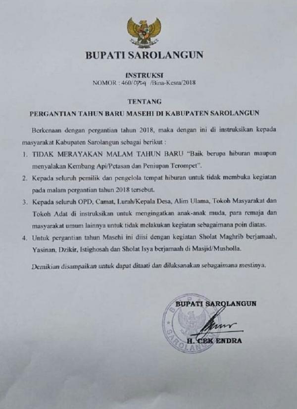 Surat edaran dari Bupati Sarolangun Cek Endra yang menginstruksikan larangan merayakan tahun baru.