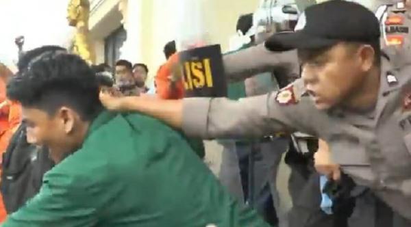 Peserta demonstrasi yang berusaha menerobos barikade polisi di depan Gedung DPRD Provinsi Jambi, Selasa (24/9/2019). (Foto: iNews.id/Adrianus Susandra)