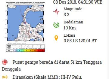 “Gempa Mag:3.3, 08-Des-18 04:31:30 WIB, Lok:0.85 LS, 120.01 BT (Pusat gempa berada di darat 51 km Tenggara Donggala), Kedalaman:10 Km. Dirasakan (MMI) III-IV Palu,” tulis BMKG di akun resmi twitternya, Sabtu (8/12/2018).