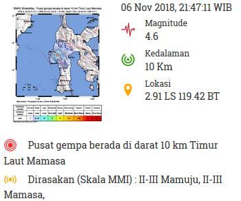 “#Gempa Mag:4.6, 06-Nov-18 21:47:11 WIB, Lok:2.91 LS, 119.42 BT (pusat gempa berada di darat 10 km Timur Laut Mamasa), Kedalaman:10 Km. Dirasakan (MMI) II-III Mamuju, II-III Mamasa,” tulis BMKG dalam akun resmi twitter-nya.