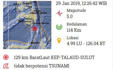 JAKARTA, iNews.id - Gempa bumi berkekuatan 5,0 skala richter (SR) mengguncang Kabupaten Kepulauan Talaud, Provinsi Sulawesi Utara (Sulut), Selasa (29/1/2019) pukul 12:26 WIB. Getaran gempa dipastikan tidak berpotensi tsunami.