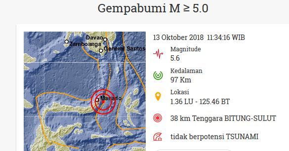 JAKARTA, iNews.id – Gempa bumi berkekuatan 5,6 skala richter (SR) mengguncang Kota Bitung, Sulawesi Utara (Sulut), Sabtu (13/10/2018) pukul 11.34 WIB atau pukul 12.34 Wita. Pusat gempa ada di laut pada kedalaman 97 kilometer (Km) di 1,36 lintang utara (LU) dan 125.46 bujur timur (BT) atau sekitar 38 Km tenggara Bitung.