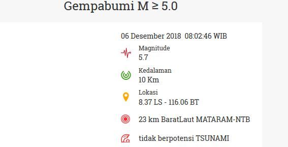 “Gempa Mag:5.7, 06-Dec-18 08:02:46 WIB, Lok:8.37 LS,116.06 BT (23 km BaratLaut MATARAM-NTB), Kedalaman: 10 Km, tidak berpotensi tsunami,” tulis BMKG di akun resmi twitternya.