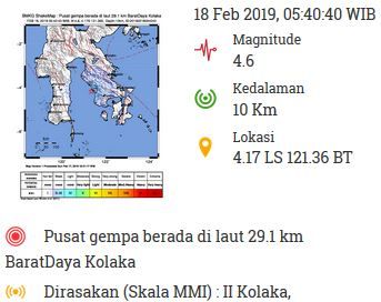 “Gempa Mag:4.6, 18-Feb-19 05:40:40 WIB, Lok:4.17 LS, 121.36 BT (Pusat gempa berada di laut 29.1 km barat daya Kolaka). Kedalaman:10 Km. Dirasakan (MMI) II Kolaka,” tulis @infoBMKG akun twitter resmi BMKG, Senin (18/2/2019) pagi.