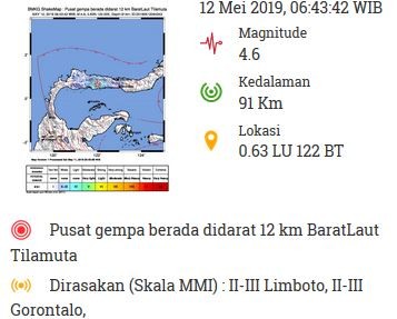 “Gempa Mag:4.6, 12-Mei-19 06:43:42 WIB, Lok:0.63 LU, 122.00 BT (Pusat gempa berada didarat 12 km BaratLaut Tilamuta). Kedalaman: 91 Km. Dirasakan (MMI) II-III Limboto, II-III Gorontalo,” tulis @infoBMKG, akun twitter resmi BMKG, Minggu (12/5/2019).