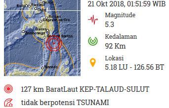“#Gempa Mag:5.3, 21-Oct-18 01:51:59 WIB, Lok:5.18 LU,126.56 BT (127 km BaratLaut KEP-TALAUD-SULUT), kedalaman:92 Km, tidak berpotensi tsunami#BMKG,” tulis BMKG dalam akun resmi twitter-nya.