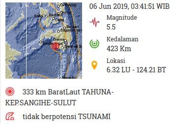 "Gempa Mag:5.5, 06-Jun-19 03:41:51 WIB, Lok:6.32 LU,124.21 BT (333 km BaratLaut TAHUNA-KEP.SANGIHE-SULUT), Kedalaman:423 Km, tidak berpotensi tsunami,” tulis @infoBMKG, akun Twitter resmi BMKG, Kamis (6/6/2019) pagi.