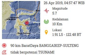 “Gempa Mag:5.7, 26-Apr-19 04:57:47 WIB, Lok:1.91 LS, 122.48 BT (Pusat gempa berada di laut 90 km Barat Daya Banggai Kepulauan). Kedalaman:10 Km. Dirasakan (MMI) III Morowali, II Sorowako,” tulis @infoBMKG, akun twitter resmi BMKG.