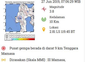 "Gempa Mag:3.8, 27-Jun-19 07:06:29 WIB, Lok:2.81 LS, 119.45 BT (Pusat gempa berada di darat 9 km Tenggara Mamasa), Kedlmn:10 Km Dirasakan (MMI) III Mamasa,” tulis @infoBMKG, akun twitter resmi BMKG, Kamis (27/6/2019).