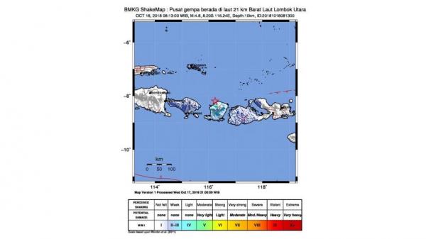 "#Gempa Mag:4.8, 18-Okt-18 08:13:00 WIB, Lok:8.20 LS, 116.24 BT (Pusat gempa berada di laut 21 km Barat Laut Lombok Utara), Kedlmn:10 Km Dirasakan (MMI) III Mataram, III Lombok Utara #BMKG," tulis BMKG melalui akun twitternya @InfoBMKG, Kamis (18/10/2018).