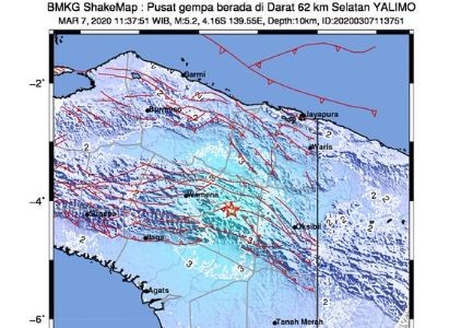 "Gempa Mag:5.2, 07-Mar-20 11:37:51 WIB, Lok:4.16 LS, 139.55 BT (Pusat gempa berada di Darat 62 km Selatan YALIMO), Kedlmn:10 Km Dirasakan (MMI) II-III Wamena,” tulis @infoBMKG, akun Twitter resmi BMKG, Sabtu (7/3/2020).