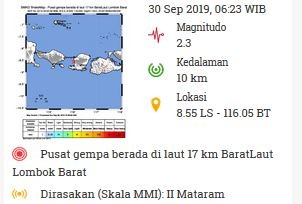 "Gempa Mag:2.3, 30-Sep-19 06:23:46 WIB, Lok:8.55 LS, 116.05 BT (Pusat gempa berada di laut 17 km BaratLaut Lombok Barat), Kedlmn:10 Km Dirasakan (MMI) II Mataram,” tulis @infoBMKG, akun twitter resmi BMKG, Senin (30/9/2019).