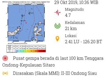 “Gempa Mag:4.7, 29-Okt-19 10:36:26 WIB, Lok:2.41 LU, 126.20 BT (Pusat gempa berada di laut 100 km Tenggara Ondong-Kepulauan Sitaro), Kedlmn:21 Km Dirasakan (MMI) II-III Ondong Siau,” tulis @infoBMKG, akun Twitter resmi BMKG, Selasa (29/10/2019).