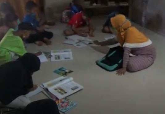 Dengan menggunakan alat seadanya, Habsa mengajar anak didiknya meski harus melantai di dalam rumah.