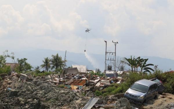 Badan Nasional Penanggulangan Bencana (BNPB) mengirimkan helikopter untuk membantu operasi water bombing yang dikoordinasikan oleh Dinas Kesehatan (Dinkes) Pemerintah Provinsi (Pemprov) Sulawesi Tengah (Sulteng), Kementerian Kesehatan (Kemenkes) dan Kesehatan TNI. Material disinfektan diisi ke dalam bucket atau ember yang telah dipersiapkan personel TNI melalui mobil tanki.