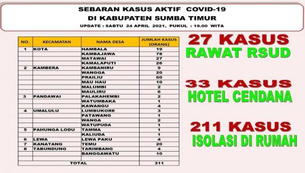 Data yang dipublikasi Posko Percepatan Pencegahan dan Penanganan Covid -19 Sumba Timur menyebutkan, hingga Sabtu (24/4/2021), pukul 19.00 WITA, tercatat kasus Covid-19 sebanyak 1.049. Dari jumlah itu, hingga kini yang masih jalani perawatan di ruang isolasi terpusat maupun mandiri mencapai 311 orang.