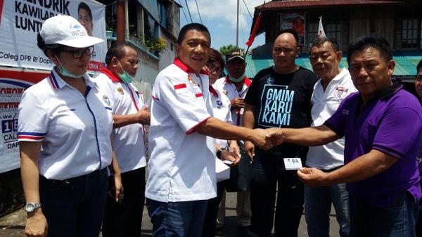 Caleg Perindo Caleg DPRD Provinsi Sulut Dapil Kota Manado, Edwin Eman menyerahkan kartu asuransi kepada warga di Kelurahan Karombasan Utara Lingkungan 3, Kecamatan Wanea, Kota Manado, Sulut, Sabtu (23/2/2019). (Foto: iNews/Subhan Sabu)