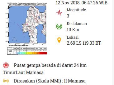 “#GempaMag:3, 12/11/2018 06:47:26 (Pusat gempa di darat 24 km TimurLaut Mamasa), Kedalaman: 10 Km. Dirasakan (MMI) II Mamasa,” tulis BMKG di akun resmi twitter-nya.