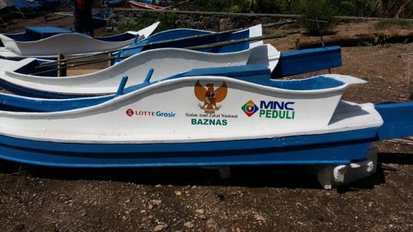 Bantuan perahu yang diserahkan kepada nelayan di Desa Lansa, Kecamatan Wori, Minahasa Utara, Sulawesi Utara, oleh MNC Peduli dan Lotte Grosir dengan menggandeng Baznas. (Foto: IST)