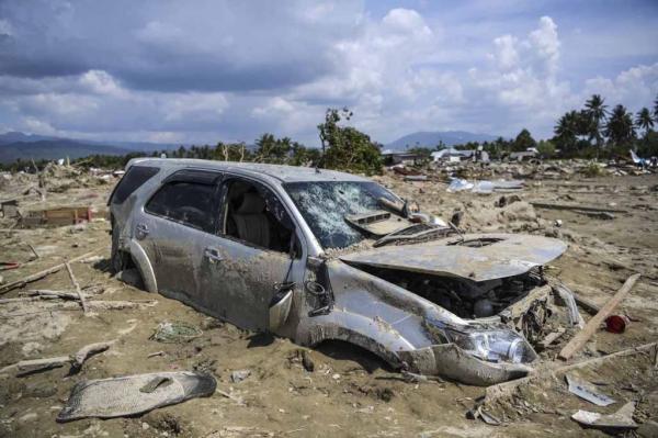 Sebuah mobil tertimbun lumpur akibat pencairan (likuifaksi) tanah yang terjadi di Desa Jono Oge, Sigi, Sulawesi Tengah, Kamis (4/10/2018). (Foto: Antara)