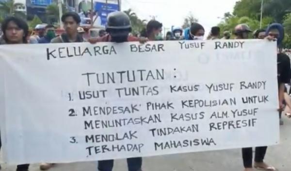 Ada tiga tuntutan yang mereka suarakan yakni, usut tuntas kasus Yusuf Randy, kedua, mendesak pihak kepolisian menuntaskan kasus almarhum yusuf, dan ketiga, menolak tindakan represif terhadap mahasiswa.