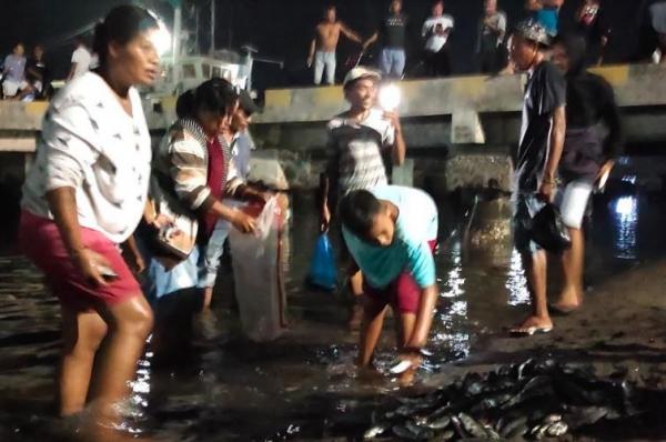 Mereka berbondong-bondong mendatangi pantai untuk berebut menangkap ribuan ikan tersebut.