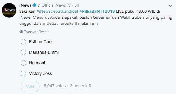Siapa pasangan calon unggul dalam debat? Masyarakat dapat menilainya dengan mengikuti jajak pendapat (polling) yang diselenggaran akun resmi iNews (@OfficialiNewsTV) di Twitter. Polling akan berjalan hingga tiga jam ke depan.