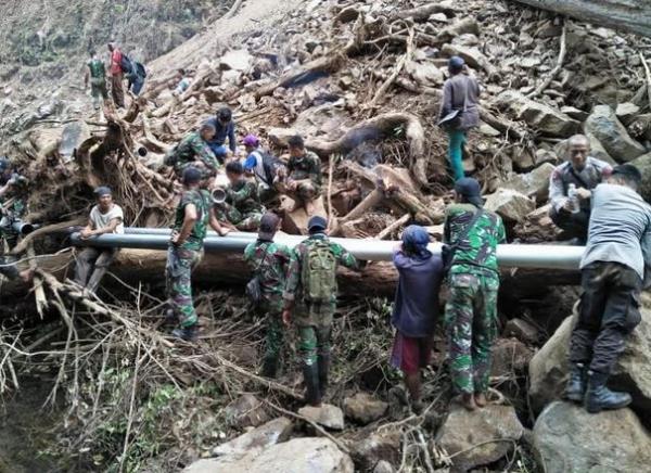 Suanjana menerangkan, selama dua hari tim gabungan anggota TNI dan Polri bersama warga masyarakat bekerja saling bahu membahu memperbaiki saluran pipa air tersebut.